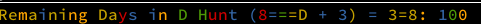 message = f'Remaining Days in D Hunt (8===D + 3) = 3=8: {remaining}'